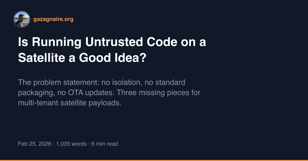 The problem statement: no isolation, no standard packaging, no OTA updates. Three missing pieces for multi-tenant satellite payloads.