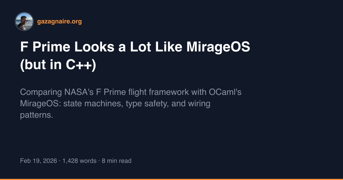 Comparing NASA's F Prime flight framework with OCaml's MirageOS: state machines, type safety, and wiring patterns.